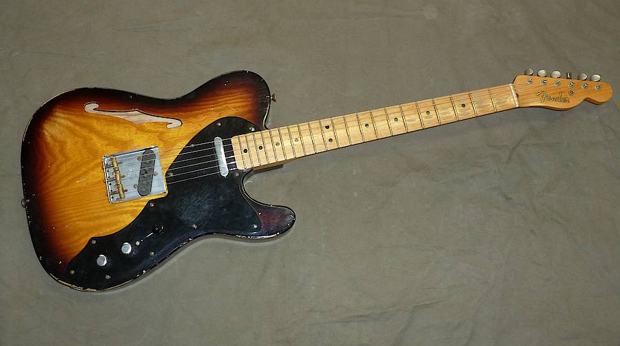 Phantastische Sunburst Thinline Telecaster aus dem Custom Shop. Wunderschön gemaserter Swamp Ash Body mit einem dicken 50’s Style Maple Neck mit 9,5“ Radius und Medium Jumbo Frets. Sehr ansprechendes , authentisches Aging – sieht richtig oberamtlich aus und macht vor Allem spielerisch richtig Spaß. Die beiden Texas Special Pickups liefern einen knackigen Klangcharakter mit schneller Ansprache ,klaren Höhen und viel Twang in Verbindung mit dem luftig, resonant und hölzern klingenden Thinline Body. Überhaupt hat diese Gitarre eher 50’s Specs wie Decal, 52′ Style Maple Neck, Schlitzschrauben , Messingbridges , Blackguard usw. Eine 50’s Thinline? Mal was Anderes . Warum nicht. Klasse Gitarre ! Mit Tweed Case und allen Case Candies.