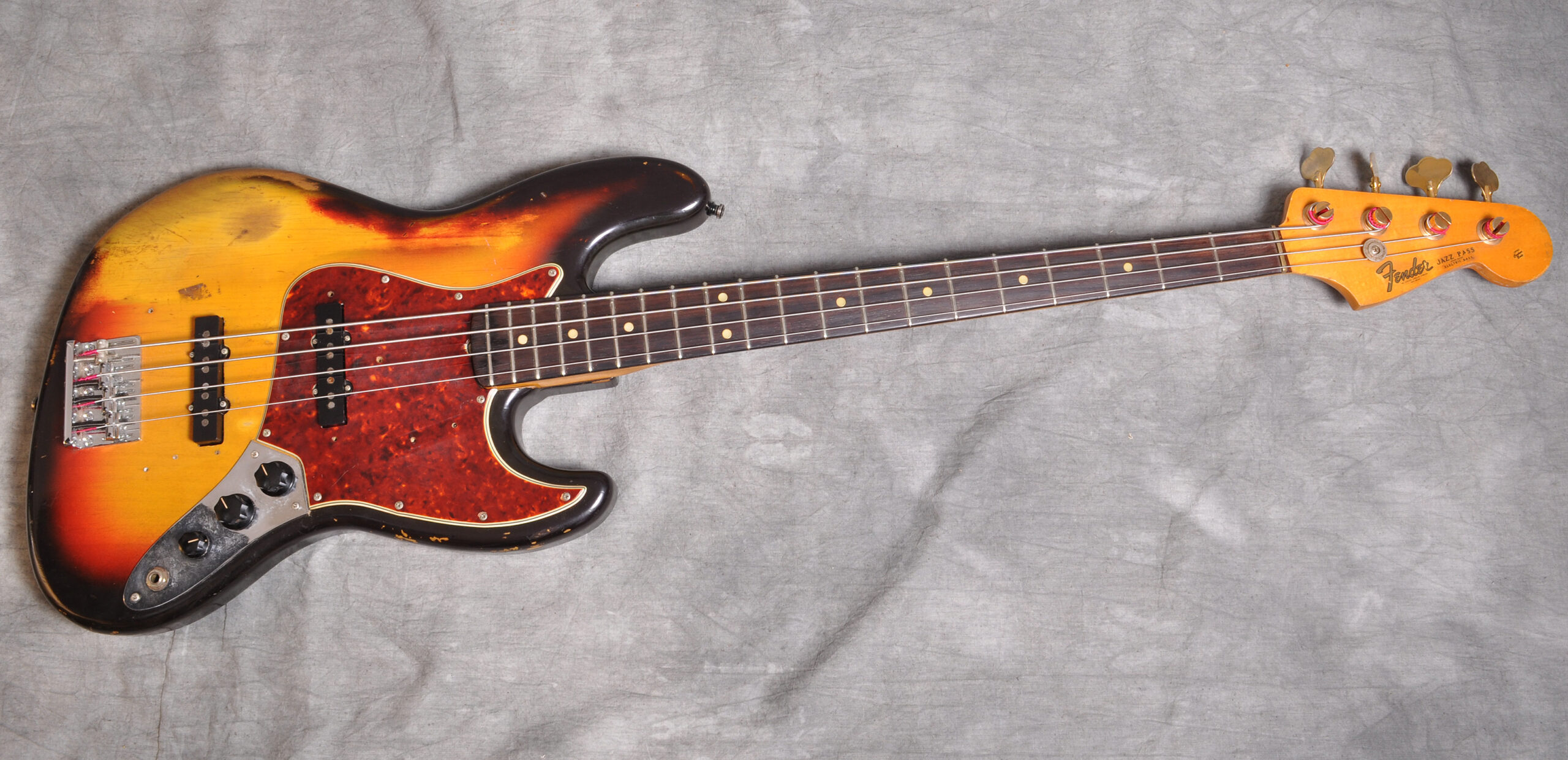 Klasse 65’er Sunburst J- Bass der wirklich Rock’n‘ Roll erlebt hat. Und genauso fühlt er sich auch an und klingt entsprechend. Der Hals ist kerzengerade und lässt sich ausgezeichnet spielen. Ein paar Issues machen den Bass für den geneigten Player etwas erschwinglicher: Die originalen Pickups sind gegen grey Bobbin Pickups aus den 70’er Jahren ausgetauscht worden.Die Volume Potis sind ersetzt. Irgendwann hat er goldene Tuner und eine massive Bridge bekommen. In der Elektronic Cavity gibt es kleine Fräsungen an den Kanten . Da war zwischenzeitlich eine andere Elektronik installiert. Toller Player J- Bass !