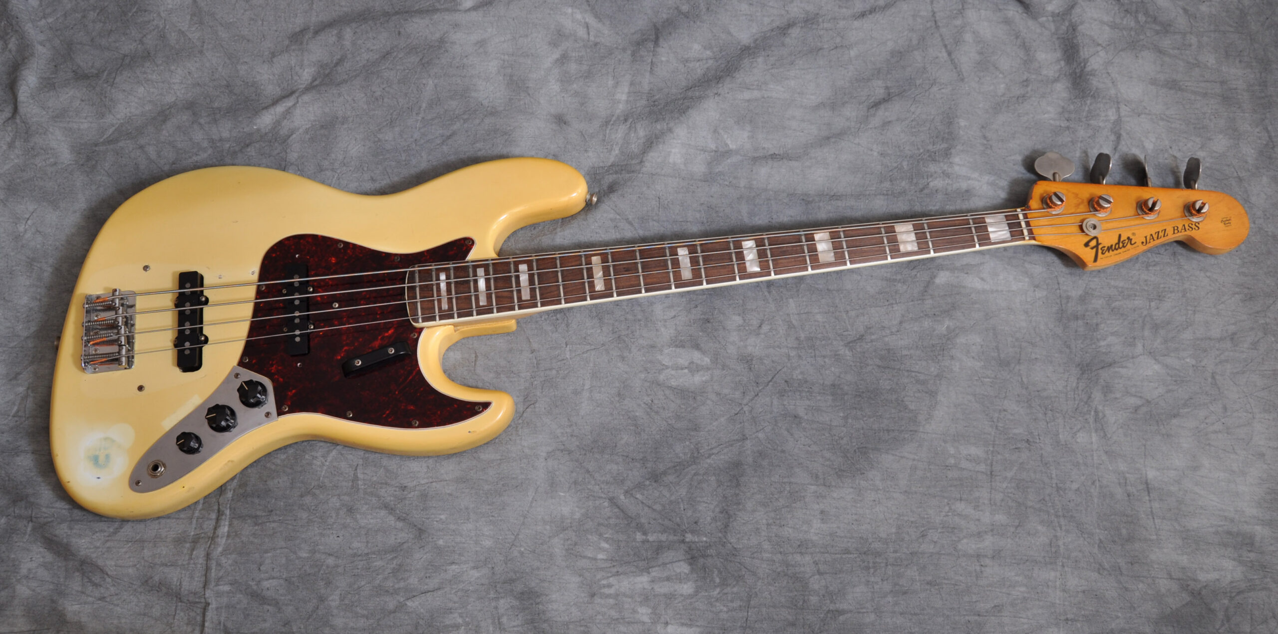 Schöner leichter ( 4,1 kg) früher 73’er Jazz Bass in schön angegilbtem Oympic White Finish. Unten war mal ein Aufkleber ‚drauf. Daher der helle Fleck. Klasse , sehr gut bespielbares Instrument . Potis und Pickups sind noch 1972 gedatet. An dem Bass ist alles im Originalzustand. Lediglich die Pickups sind kürzlich von Harry Häussel mit Originaldraht neu gewickelt worden. Und wer Harry kennt weiß die dann hervorragend klingen. –