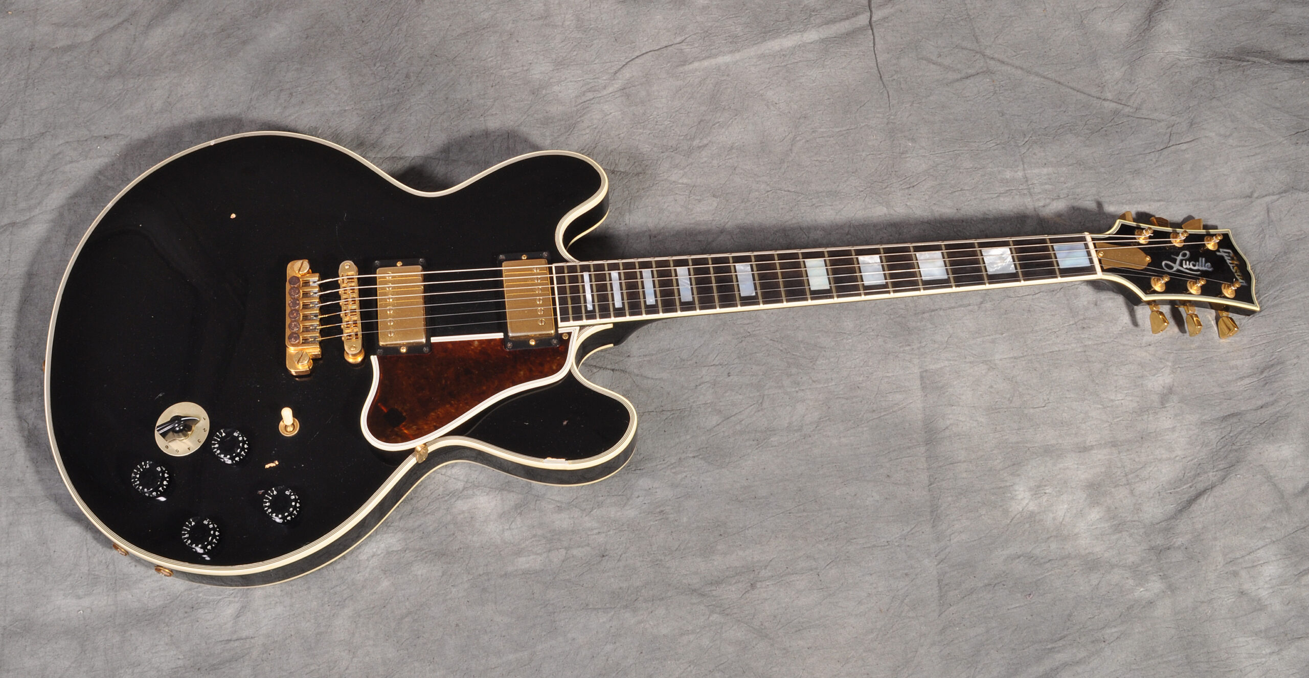 Rare B.B. King Lucille von 1998. Die Lucille wurde nach B.B.’s Specifications gebaut. Im Prinzip ist es eine ES 355 ohne F-Löcher.Natürlich hat sie noch ein richtiges Ebony Fretboard with Mother of Pearl Inlays. Sie ist außerdem ausgestattet mit Gold Parts, Fine Tuning Tailpiece TP-6 und Vari-Tone Switch für eine entsprechende Soundvielfalt. Die Gitarre ist insgesamt noch im sehr guten Originalzustand mit einigen Gebrauchsspuren. Die Bünde sind noch ausgezeichnet und der Hals ist prima bespielbar. Dazu trägt auch das für diese Modelle sehr moderate Gewicht von nur 4,16 kg bei.