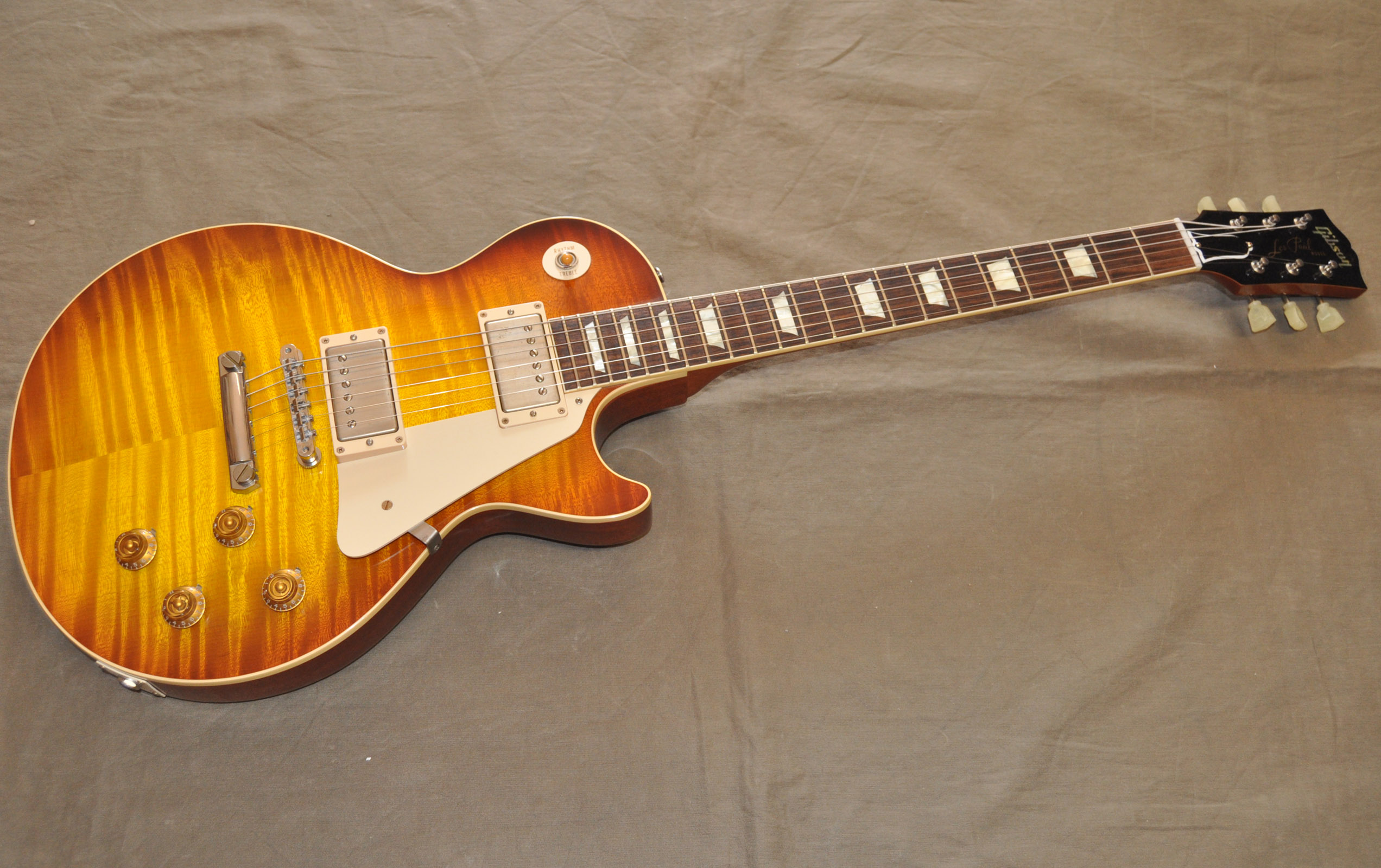 Traumhafte Custom Select ( 25 Stück weltweit als Limited Editon, diese hat die Nr. 22) R 9 Les Paul Standard in Antique Dark Tea Burst Finish. Diese Gitarre hat wirklich eine der schönsten Riegelahorndecken die wir hier gesehen haben und ist insgesamt aus ausgesuchten , selektierten Hölzern hergestellt was auch tonal deutlich hörbar ist. Die Gitarre sieht nicht nur absolut toll aus sondern sie klingt auch derartig durchsichtig und resonant daß es eine reine Freude ist auf ihr zu spielen. Sie ist nur wohnzimmergespielt aus Sammlerhand und kommt mit Case Candies und natürlich Originalcase. Gewicht 3,96 kg.