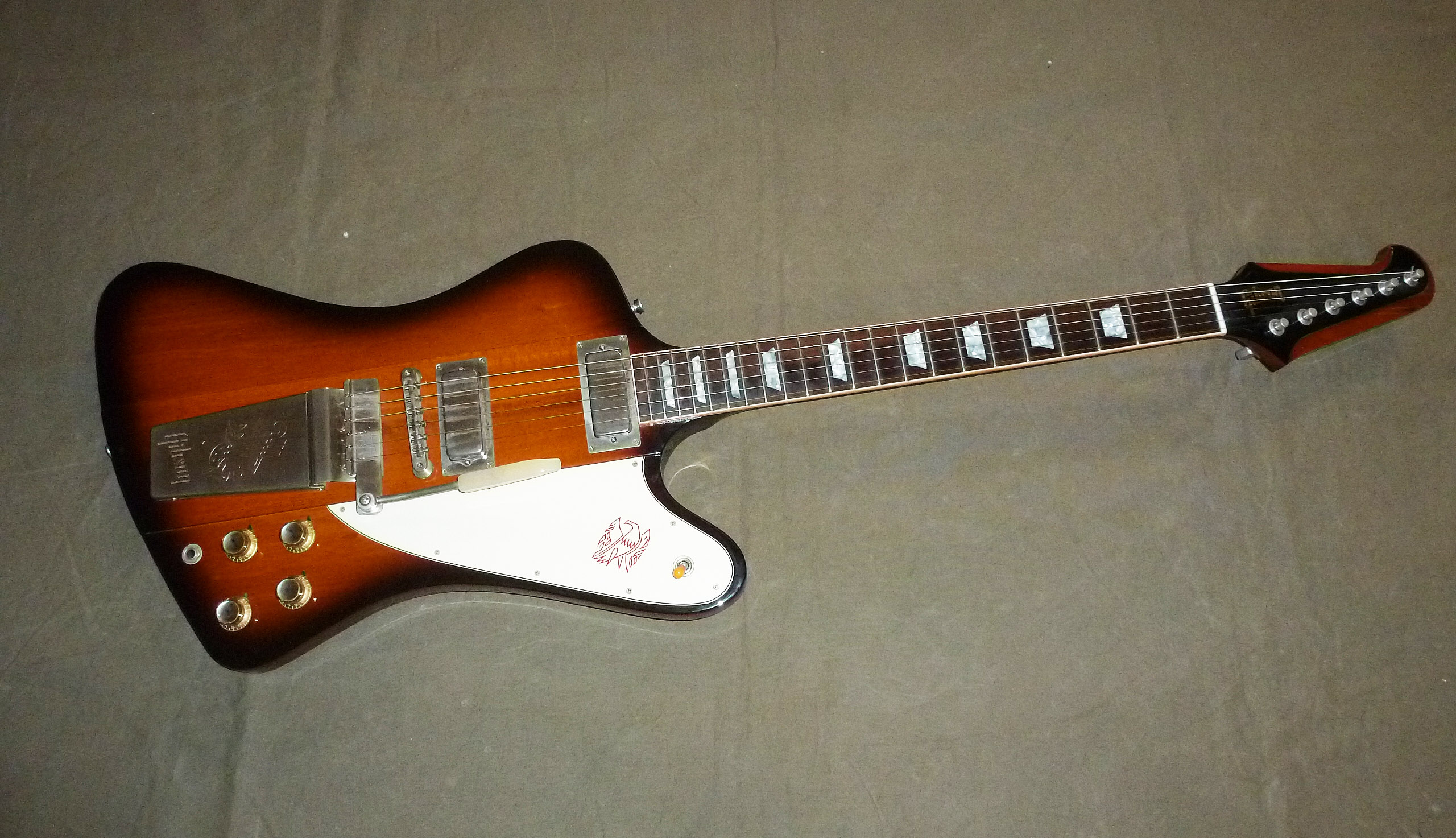 Phantastische Custom Shop 63’er Firebird V. Absolut Authentisch in Farbe , Ton und handling. Durchgehender , mehrteilig gesperrter Mahagonieneck . 2 kräfige Firebird Mini Humbucker, Maestro Tremolo, Banjo Mechaniken. Exakt so wie man sie von damals kennt ! So muß eine Firebird sein! Im Originalcase mit Case Candies .