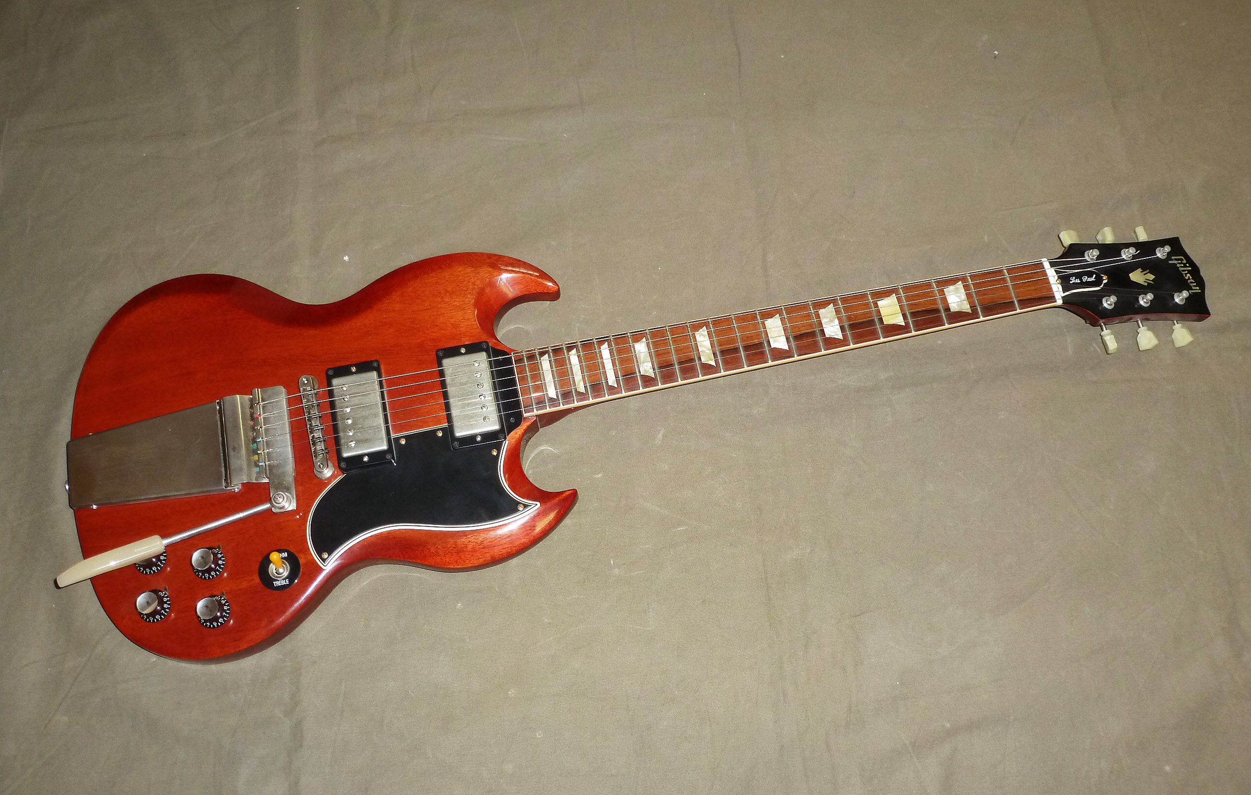Klassische Cherry Red L.P SG Standard mit Maestro Vibrola Tailpiece. Absolut authentisch – Shapings, breiter fetter Mahagonieneck natürlich mit dem early 60’s Halsansatz,Headstock, Maestro Tailpiece, Burstbucker PAF’s – genau wie sie sein muß und so nahe am Original wie nur möglich. Spielt und klingt hervorragend. Kommt im Originalcase mit Case Candies.