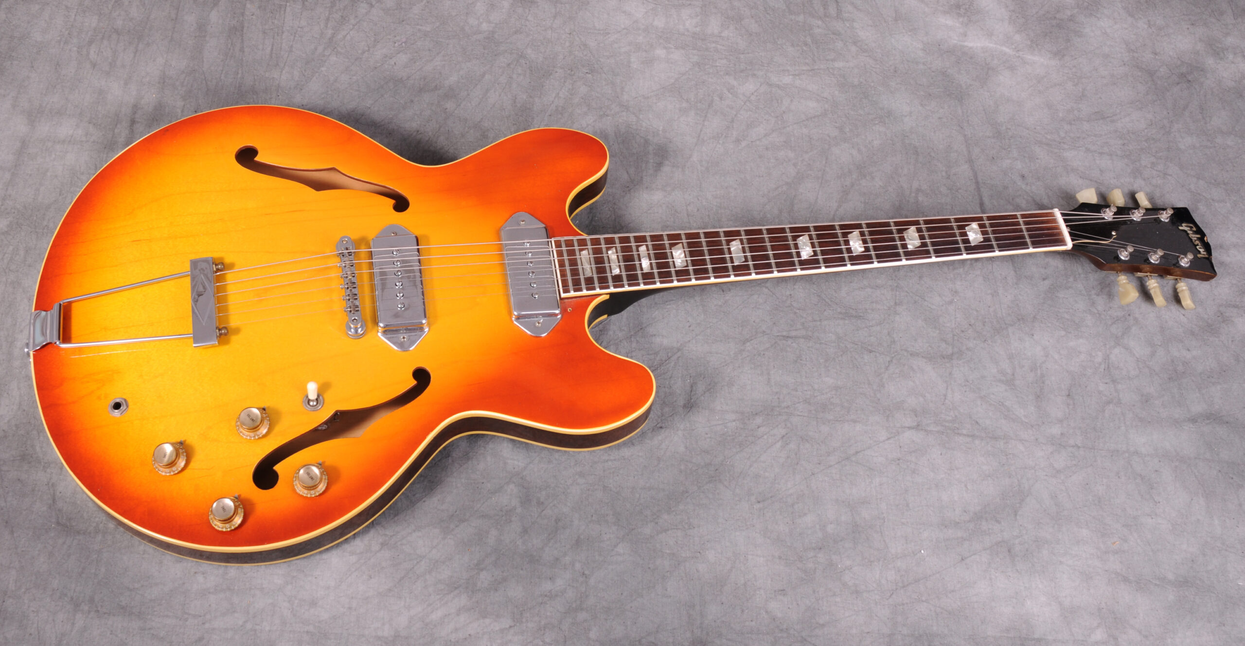 Rare Long Neck Version der ES 330 TD in wunderschönem Iced Tea Sunburst. Excellent Condition mit nur sehr wenigen Gebrauchsspuren . Außer einem kleinen Lackschaden auf der Rückseite des Headstock wo mal ein Aufkleber gesessen hat in super Zustand. Die Gitarre kommt vom zweiten Besitzer der sie seit Ende der 70’er Jahre hatte. Alles soweit original bis auf die Bridge Saddles, den Sattel und die Tulip Tuner (sind aber auch alte Vintage Tuner aus der Zeit , keine Repros!)Das Pickguard fehlt leider. Sehr gut klingende , sehr resonante und leichte Gitarre mit P 90 Pickups. Macht Spaß! Kommt im braunen Vintage Repro Case.