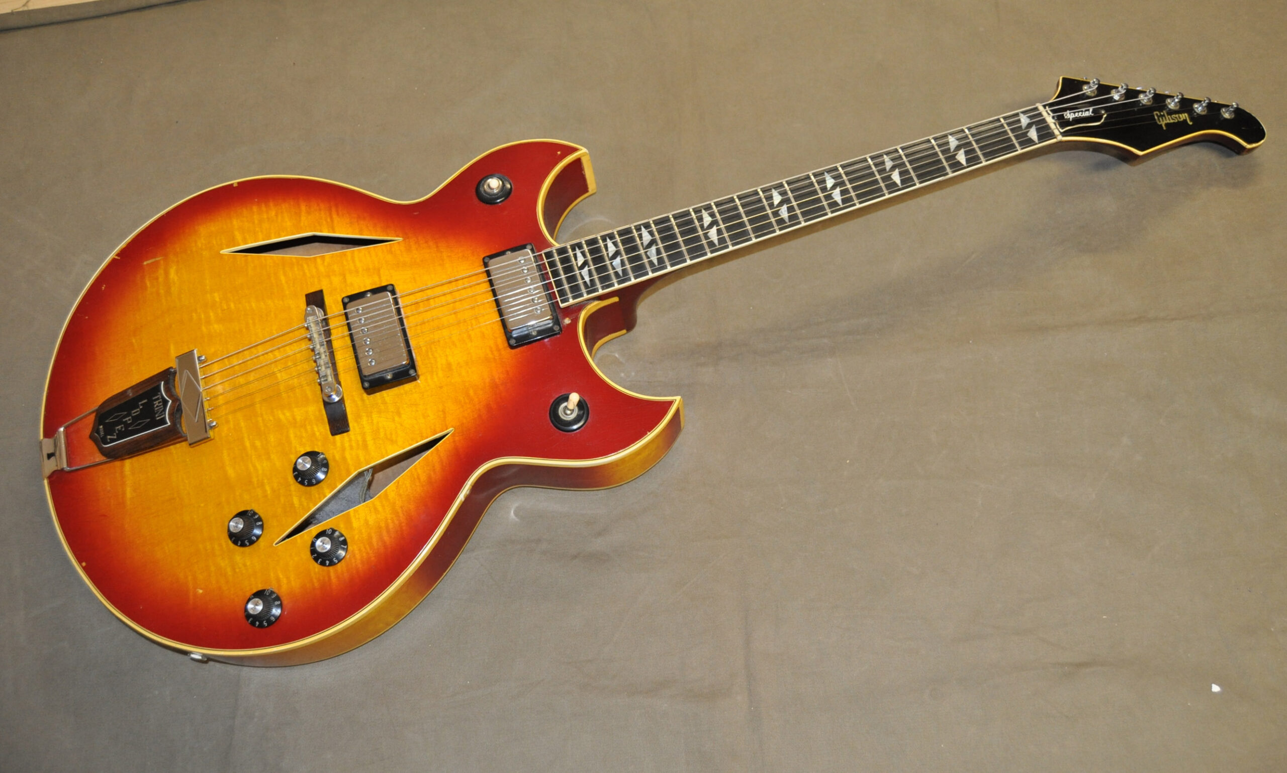 Wenn das kein Eyecatcher ist so eine Trini Lopez. Absolute Showgitarre könnte man meinen wenn es nicht eigentlich eine vollwertige full Size Jazzgitarre wäre. Geschmackvoll Sunburst lackierter Full Size Body mit zwei spitzen Cutaways, Mahagoni Neck mit Firebird Headstock und Ebenholz (!) Griffbrett, 2 Pat. – No. Humbucker, Trapeze (Trini Lopez) Tailpiece. Schaller Tuner – die originalen 6 in a row Kluson Tuner sowie auch das originale Schlagbrett ( die Halterung ist nicht vollständig ) sind dabei. Also bis auf die Tuner und das Truss Rod Cover alles original und ohne Reparaturen. Die üblichen Gebrauchspuren des jahrzehntelangen Einsatzes sind natürlich vorhanden . Strukturell eine tolle Gitarre die auch ausgezeichnet klingt. Mit original Case.
