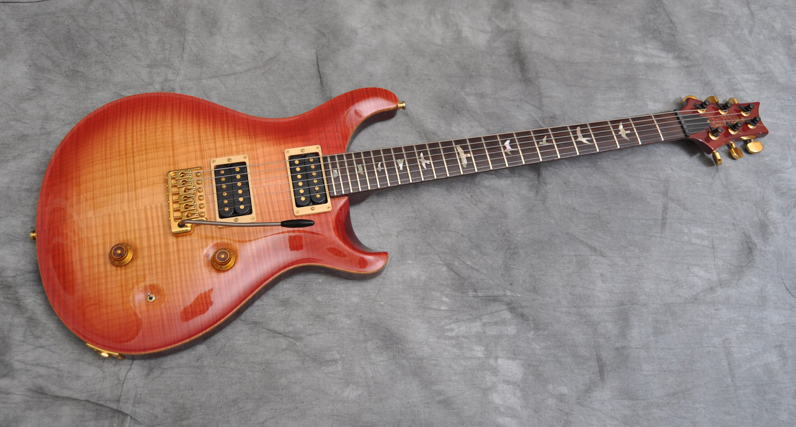 Excellente Cherry Sunburst PRS Signature aus den letzten Serien von 1991 ( Nr. 860 von 1000 ) mit fantastisch geflammter Ahorndecke. Die Signatures waren quasi die Vorläufer der späteren Private Stock Serien. Jedes Jahr gab es nur 1000 Stück . Gefertigt aus handverlesenen Hölzern und von daher das Highlight der damaligen Produktionsreihen sind sie der „ holy Grail „ der Sammler von Pre Factory PRS Gitarren. Eine toll klingende und super bespielbare Gitarre und noch dazu ein wahrer Eyecatcher. Ausgezeichneter Zustand mit nur moderaten Gebrauchsspuren. Kommt im Originalcase . CITES – Bescheinigung vorhanden.