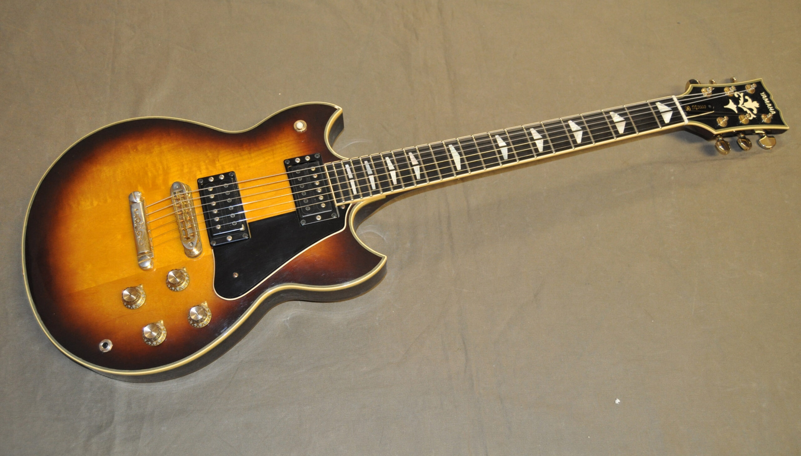 Superschöne, seltene YAMAHA SG 2000 in Dark Antique Sunburst.Dieses Modell erlangte in den späten 1970’er Jahren absoluten Kultstatus und wurde hauptsächlich durch einen gewissen Herrn Carlos Santana populär der sie lange spielte.Sie genießt immer noch den Ruf absoluter Perfektion bis ins Detail. Supergenaue Verarbeitung und technische Innovationen des japanischen Instrumentenbaus sind hier vereint: Durchgehender Ahornhals mit Mahagonistreifen an den Seiten und Ebenholzgriffbrett m. Mother of Pearl Inlays. Mahagoni Body mit Ahorndecke.Vergoldete Messing Hardware mit Sustainplate unter der Bridge.2 kräftige und trotzdem durchsichtige Humbucking Pickups. Originalzustand mit Originalcase.